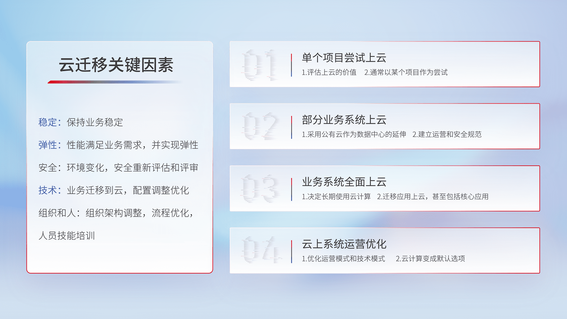 结合实际业务,,,,从规划设计、、、、云平台选型、、、、云原生改造、、、、数据迁移、、集成交付,,迁移全过程为客户识别最佳上云路径,,做好风险识别管理,,设计网络架构、、身份权限、、安全审计合规、、操作审计、、日志审计、、监控告警策略、、多站点容灾设计等,,,对云上基础设施进行整体规划,,提升IT治理水平,,,以满足弹性、、、、高可用、、高性能的需求。。。