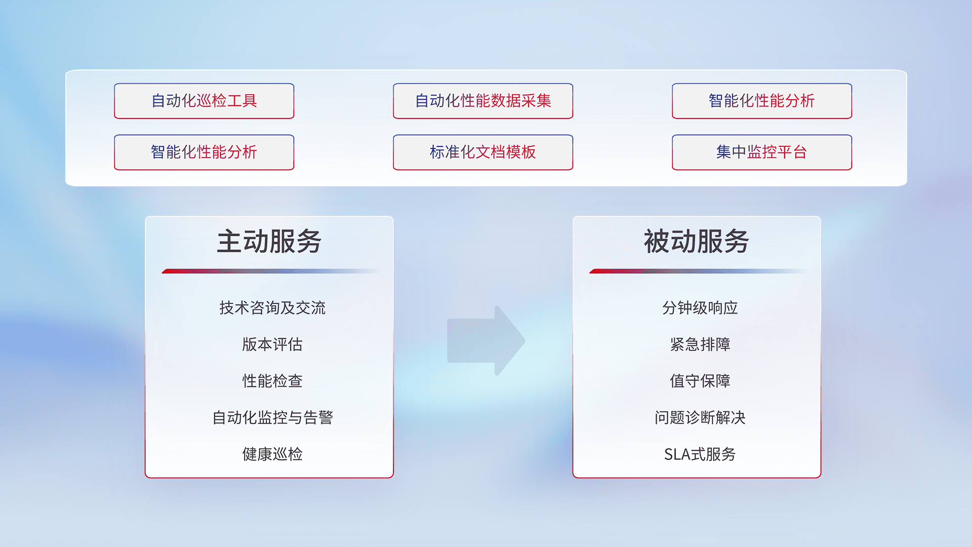 智能化工具和标准化文档,,,,保障服务质量,,,提供主动服务(包含技术咨询、、、、版本评估、、、性能检查、、、自动化监控与告警、、、健康巡检)和被动服务包含(分钟级响应、、、紧急排障、、、值守保障、、问题诊断解决、、、SLA服务)。。。