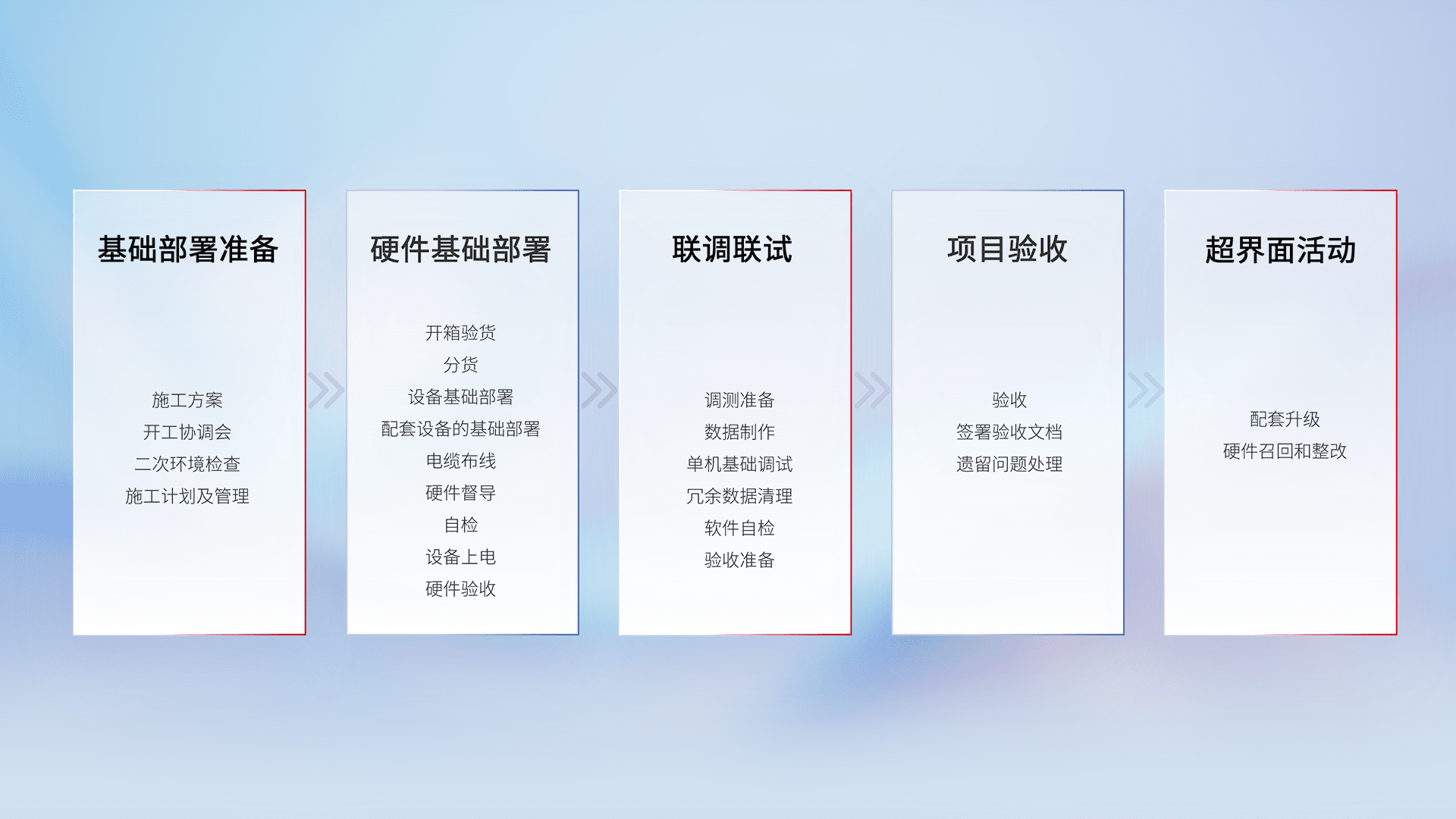 从基础部署准备、、硬件基础部署、、、、联调联试、、、项目验收、、越界面活动的全过程可追溯,,保证施工质量和进度。。