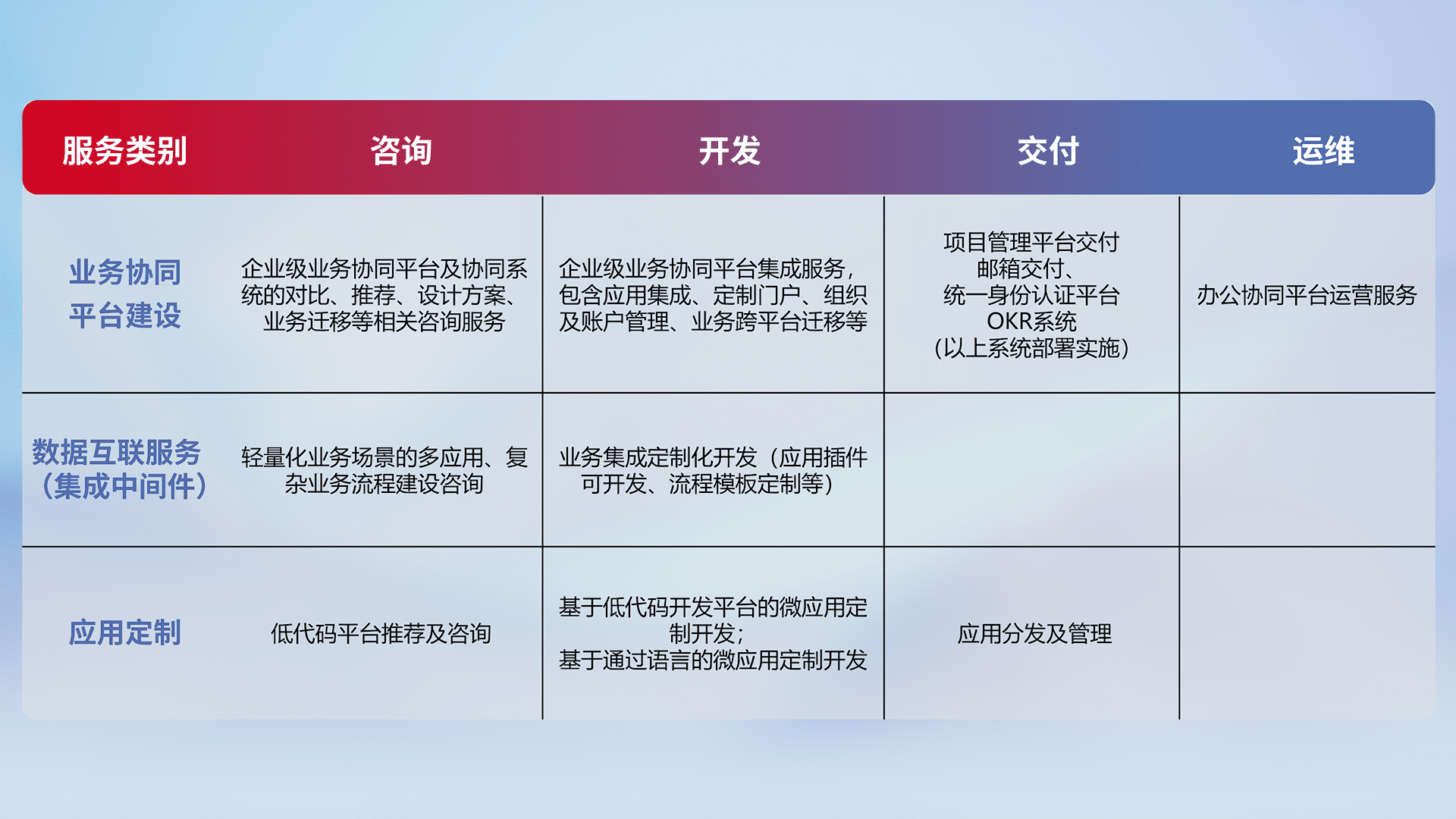 针对钉钉、、、、企微、、、IDaas等平台级产品提供产品的规划、、、、方案、、交付、、、、定制化开发等服务,,实现如统一协同办公、、、智能客户服务、、混合会议管理、、、智能数据查询、、、、等业务场景,,实现数字化转型。。。。